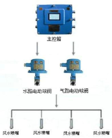 當傳感器探測到控制信號時,信號送入主控箱,主控箱先后控制高壓風閥、高壓水閥開啟,將高壓風、高壓水輸送到風水噴頭(即氣水噴頭)進行噴霧降塵(風水噴頭可對風水壓力大小進行調整),噴霧工作至延時時間(延時可調)停止噴霧降塵;當信號再次觸發(fā)時,進行下一個工作循環(huán)過程。