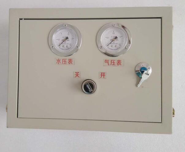 ZPFS氣控式風(fēng)水聯(lián)動(dòng)噴霧降塵裝置控制箱(以下簡(jiǎn)稱控制箱)采用內(nèi)置風(fēng)、水控制閥對(duì)裝置用風(fēng)、水壓力進(jìn)行調(diào)控,對(duì)風(fēng)水比例進(jìn)行均衡,采用氣控閥(控制箱圖片上的“開(kāi)關(guān)”)控制噴霧裝置的開(kāi)啟與關(guān)閉??刂葡溟T扇上鑲嵌氣控閥(開(kāi)關(guān)旋鈕)控制噴霧裝置的開(kāi)啟與關(guān)閉,鑲嵌有水壓表、氣壓表,分別顯示調(diào)控后的水、氣壓力。